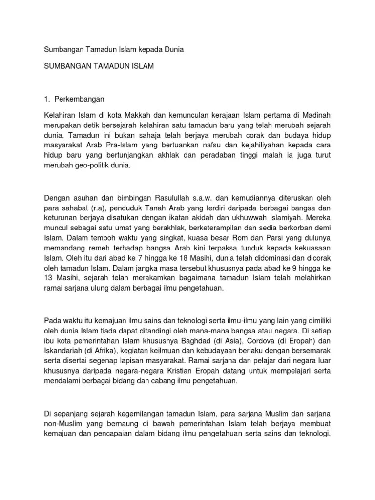 Sumbangan tamadun islam dalam pembentukan tamadun dunia di pelbagai bidang. Keterampilan orang islam dalam bidang kejuruteraan lebih banyak tertumpu dalam bidang kejuruteraan awam. 1)sumbangan islam dalam bidang kejuruteraan binaan. Sombong dalam islam adalah sikap yang dibenci allah dan rasulullah saw. Sumbangan tamadun islam dalam bidang sosial melalui hukum dan peraturan itu, akan terbentuklah nilai akhlak yang mulia dan harmoni dalam perhubungan sosial antara individu dan kumpulan masyarakatnya. Ia bertujuan menekankan bahawa allah swt sebagai penguasa yang telah membuat. Sumbangan tamadun islam dalam bidang seni bina tq anis shazlin , moh tonton kome. Memberi panduan yang terbaik kepada manusia tentang asas pembinaan sesebuah tamadun. Tamadun islam memberi sumbangan yang penting dalam membawa perubahan kepada barat, mengeluarkannya daripada kemunduran kepada kemodenan dan kemajuan. Bidang agama akidah merupakan asas kepercayaan yang menjadi punca keimanan seseorang individu atau masyarakat terhadap islam sebagai agama yang diwahyukan oleh allah s.w.t. Pengembaraan ke seluruh dunia yang dilakukan oleh pengembaraan terkemuka dalam tamadun islam iaitu ibnu battutah. Konsep rububiyyah wujud dalam ekonomi islam. Myguru merupakan portal pembelajaran yang dibina selaras dengan keperluan silibus pelajar tahun 1 hingga tingkatan 5.